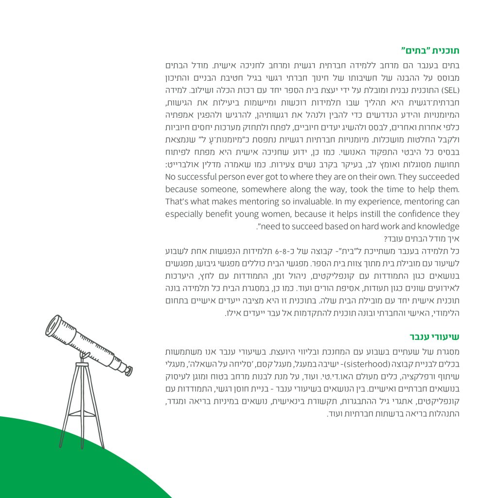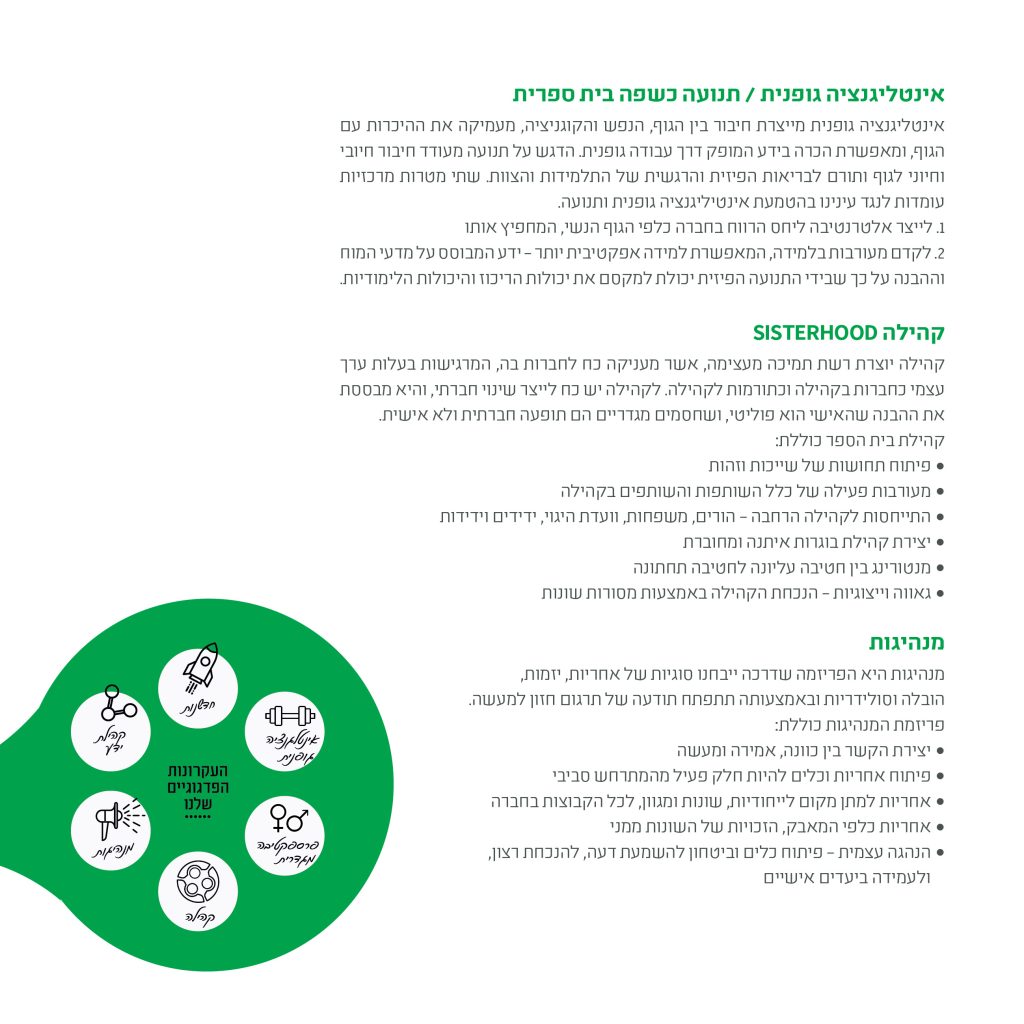 מה אם היינו יכולות להקים מסגרת מעולה שתיתן לתלמידות בגיל כל כך קריטי, רגיש ומטלטל, להתפתח ולהתמודד עם התבגרותן ללא הפרעות רקע. למצוא את הזהות שלהן, את קולן הפנימי, ולהביא את הקול הזה לידי ביטוי. לתת להן להתבגר בקצב שלהן, להפוך מנערות לנשים כשהן מוכנות ולא כשהחברה לוחצת. ללמוד להקשיב לעצמן ולא למה שהקודים החברתיים מכתיבים להן להיות.