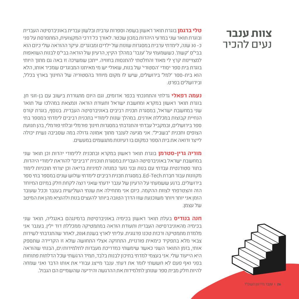 מסגרת שתעודד אותן לאקטיביות קהילתית, חברתית, ציבורית. שתדרבן את התלמידות להשתתף ולהוביל את המשחק ולא לצפות בו מהטריבונה. מסגרת שתקדם ותבנה sisterhood – רשת קשרים חזקה ומשפיעה שתלווה את הנערות גם בעתיד. מסגרת שתכשיר את מנהיגות המחר. אז זהו, שאנחנו יכולות, ואנו בונות אותה ממש בימים אלו – "ענבר", מסלול חדשני לתלמידות. באגודה לקידום החינוך העסק שלנו הוא – חינוך. חינוך דור העתיד זו ההשקעה הכי משתלמת שלנו. חינוך ייחודי לתלמידות יצמיח נשים חזקות, פעילות ומודעות וכולנו רק נרוויח מזה. כך נוכל לייצר שינוי ולהגיע למצב בו הנתון האבסורדי איתו פתחתי ישתנה ויתאזן.