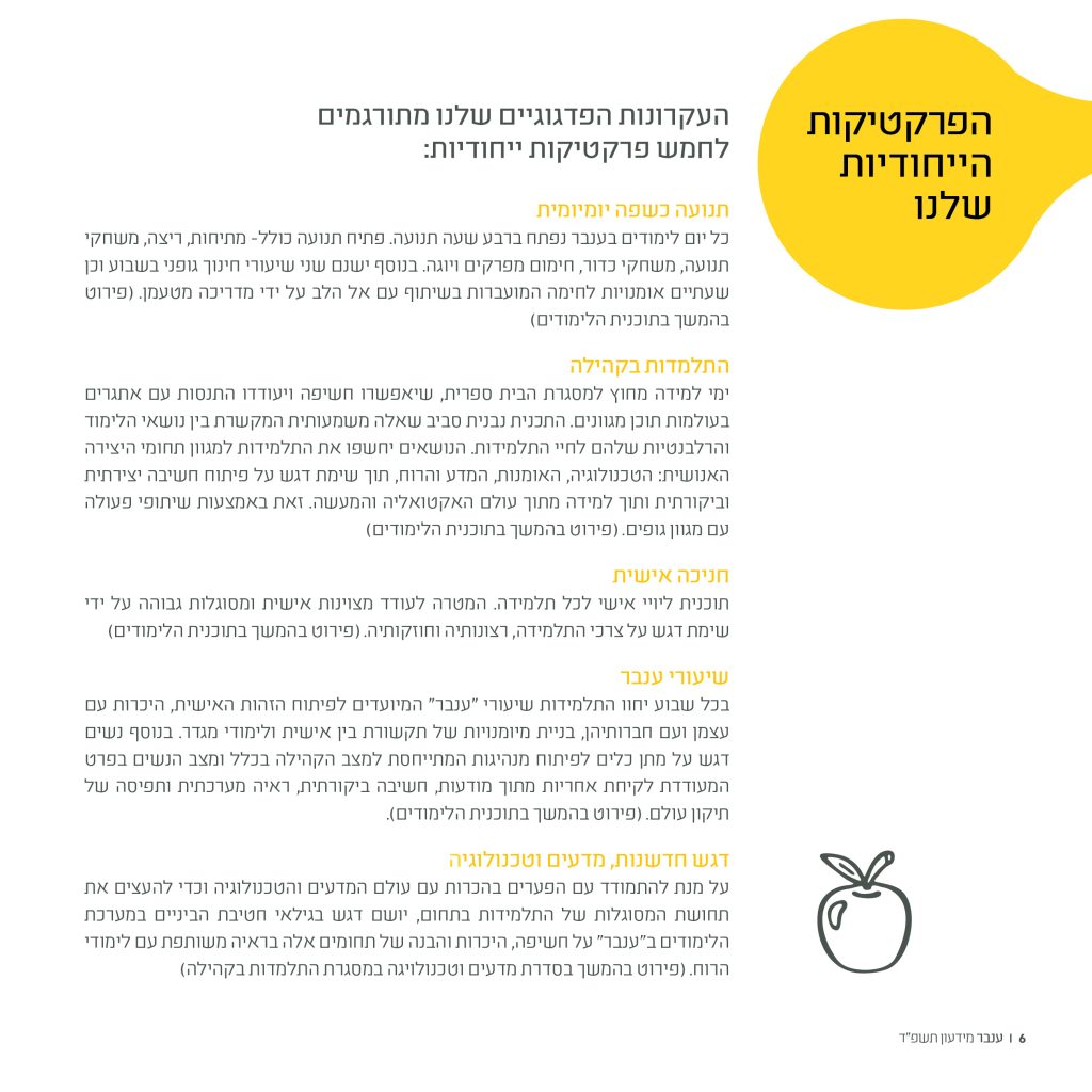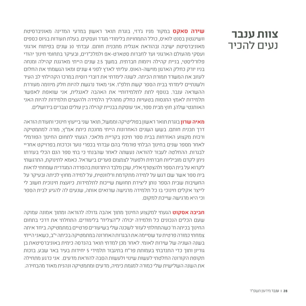 אני רואה ב"ענבר" הזדמנות עבור תלמידות, משפחות וצוות לבנות קהילה אשר מייצרת מרחב מיטבי לצמיחה של תלמידות. קהילה שתעודד את התלמידות לבנות את זהותן מתוך היכרות עם עצמן ועם דעותיהן, שתעודד אותן להציב לעצמן יעדים לימודיים, אישיים וחברתיים ותקנה כלים אפקטיביים וחדשניים למימוש יעדים אילו מתוך סביבה תומכת, חיונית ומקצועית.