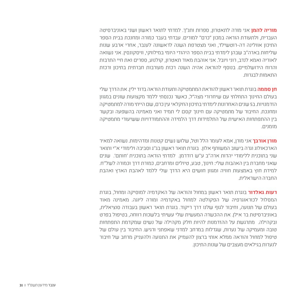 אני מאמינה שלמערכת החינוך תפקיד מכריע בעיצוב פני החברה הישראלית. באחריותי כאשת חינוך וכמורה לייצר מרחב המאפשר בחירה חופשית ושוויון הזדמנויות אמיתי עבור תלמידות.
