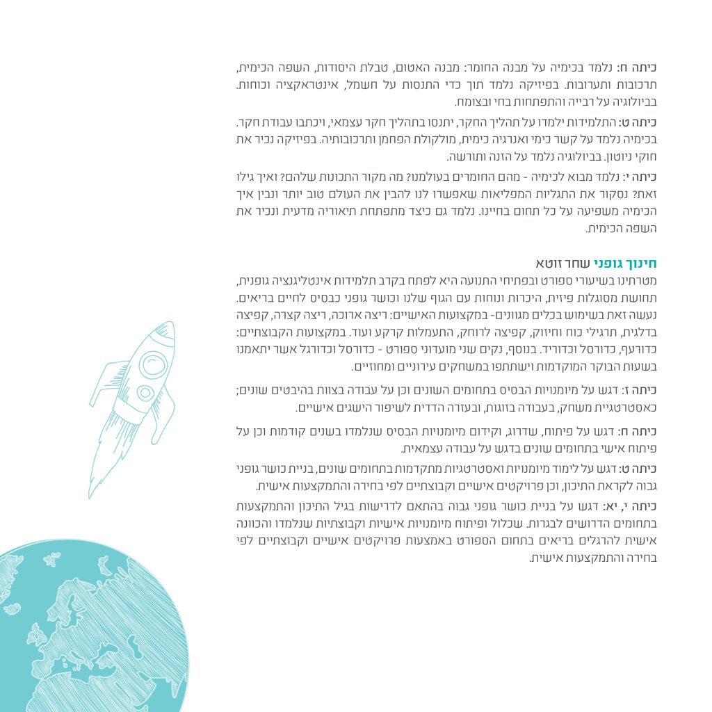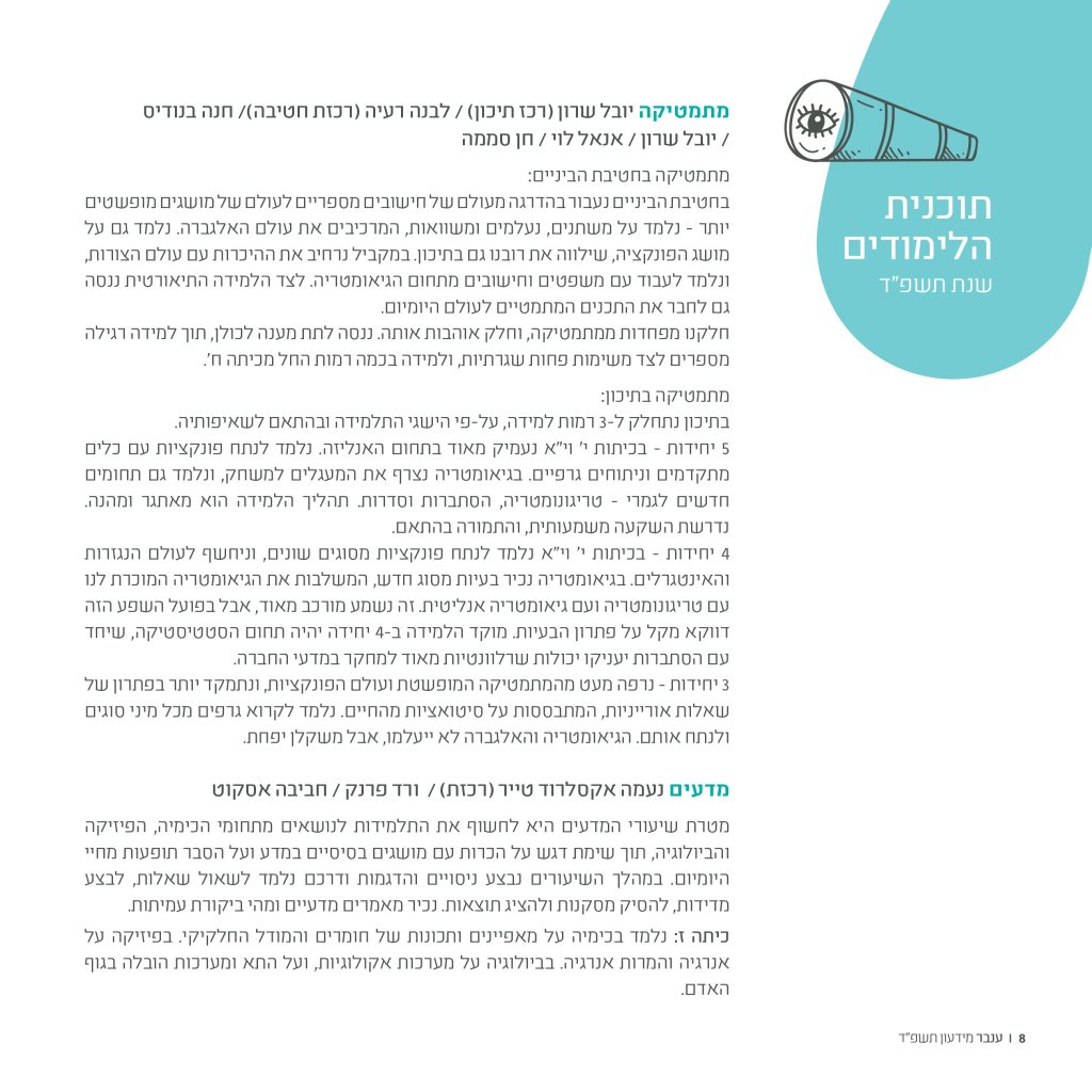 תכנית מוגברת ללימודי מדעים וטכנולוגיה – במטרה לפתח בקרב התלמידות ידע ובטחון בתחומי המדעים וכלים לתרגום הידע שהן רוכשות לעולם המעשה.